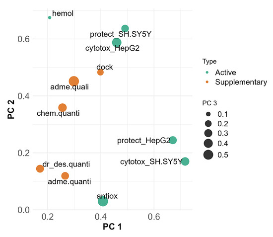 In PC 3, most of the active and supplementary variables are moderately represented. ADME and solubility quantitative predictions, chemical property predictions and drug-likeness are grouped together and with the active variables, except for hemolysis, antioxidant assays and cytotoxicity in HepG2.