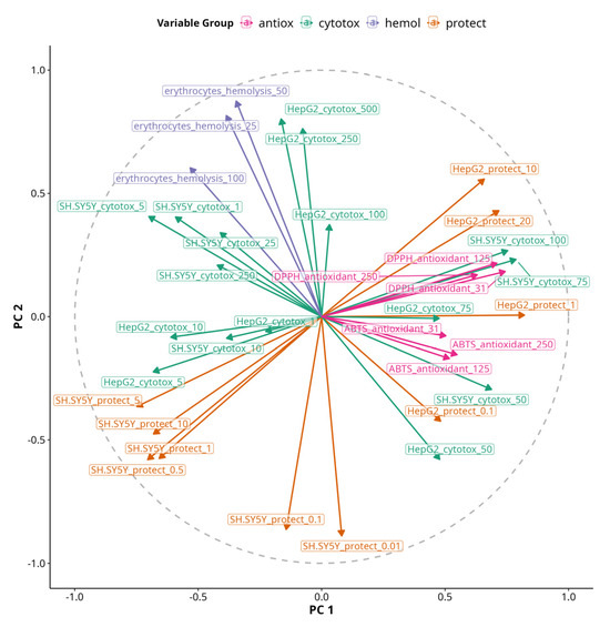 The variable most aligned with PC 1 was HepG2 viability protection under 1 µM treatment, while the most aligned with PC 2 was HepG2 cytotoxicity under 250 and 500 µM treatments. Antioxidant assays were also positively correlated with PC 1, but DPPH had slightly positive coordinates on PC 2, while ABTS had slightly negative coordinates. Inversely related to PC 2 was viability protection of SH-SY5Y under 0.01 and 0.5 µM treatments. Hemolysis was correlated with PC 2 and slightly inversely correlated with PC 1. However, the most pronounced effects on erythrocytes were negative as no significant hemolysis was observed with any of the treatments, but some of them caused membrane stabilization and had negative values. Thus, the arrow essentially shows the opposite of the presence of membrane-stabilizing effects, so we can hypothesize that the protective effects on SH-SY5Y at 0.01 and 0.5 µM are associated with membrane stabilization. Viability protection on SH-SY5Y under 0.5 µM treatments was inversely correlated with both PC 1 and PC 2. Viability protection on HepG2 under 10 and 20 µM treatments was positively correlated with both PC 1 and PC 2, indicating the presence of both protective and cytotoxic effects with increasing treatment concentrations.