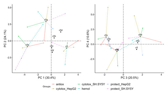 In the left plot in Figure 9, 5g has relatively strong positive coordinates on PC 2, 5 has positive coordinates on PC 1 and 5a has negative coordinates on PC 1. The partial points show that the variables which separate 5 from other points in dimensions 1 and 2 are hemolysis, which is negative on PC 2, and radical scavenging, which is positive on PC 1. 5g is separate predominantly because of its positive coordinates in PC 2 due to cytotoxicity in HepG2 and hemolysis. 5a is separated because of the prominently negative coordinates of all partial points except for hemolysis and radical scavenging. It also has negative coordinates on PC 2 due to viability protection on both SH-SY5Y and HepG2.