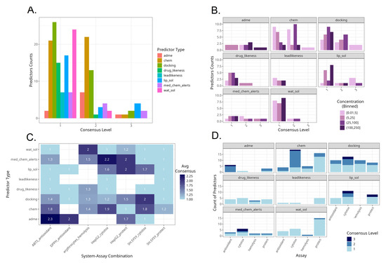 Summaries of model consensus levels across predictors and assays. (A). Counts of predictor types by consensus level. (B). Counts of predictor types by consensus level and in vitro assay concentration range. (C). Average consensus levels by predictor type and specific experimental system. (D). Counts of predictor types by consensus level and in vitro assay type.