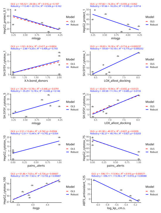 A few correlations were observed with in vitro data from assays for oxidative stress protection. Both correlations were with SH-SY5Y cells. At 5 and 10 µM, the protective effects were negatively correlated with molecular size-related parameters. Hemolysis at 100 µM was inversely correlated with water solubility-related predictors and DPPH at 250 µM was positively associated with the number of H-bond donors and TPSA.