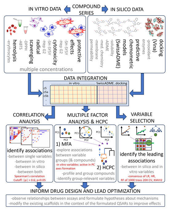 A typical feature of the collected in vitro data is that they represent readings after treatment with more than one concentration and more than one replicate per concentration. The number of concentrations for each assay varies, and most concentrations are in the range between 1 and 100 µM. This part of the dataset consists of 7 unique model–endpoint combinations and 16 unique concentrations, some of which coincide across models and endpoints, while others differ. Unlike in vitro data, the in silico part of the dataset (except for docking scores) consists of single predicted output values, representing mostly predicted constants as mw, TPSA, LogP, bioavailability score, etc., which do not vary with concentration. They are generated based on the sole input being the chemical structure of compounds in an appropriate file format [56]. Many of the in silico parameters represent redundant information due to some of them being the output of models, predicting the same or a related physicochemical or medical chemistry-related parameter. All endpoints were included in order to not disregard the identification of weak associations due to the small observation size and the effects of outliers. Most of these parameters are represented as numeric values, but some are nominal (i.e., P-gp substrate) or ordinal (i.e., LogS water solubility class).