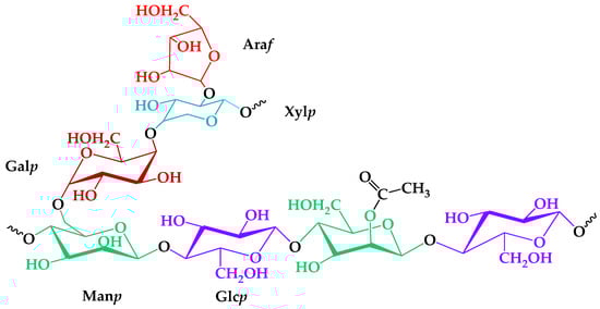 Here, we focus on one of the common types of hemicelluloses obtained from softwoods—galactoglucomannan (GGM). This neutral polysaccharide’s structure is represented mainly by β-D-mannopyranoses (Manp), commonly substituted by α-D-glucopyranosic (Glcp) and β-D-galactopyranosic (Galp) units, linked through β-(1→4) glycosidic linkages [25]. GGM’s solubility and chemical activity depend on different ratios of substitution by these units, affecting its accessibility and high reactivity.