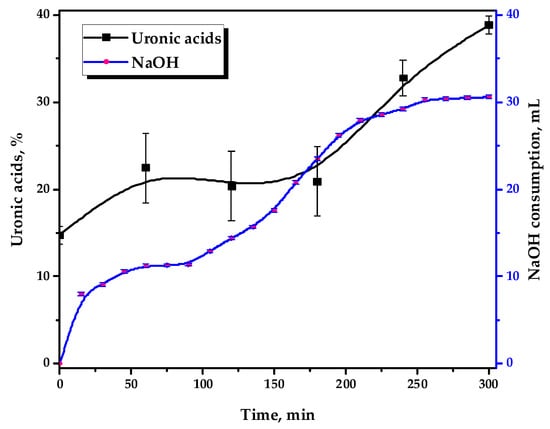 Figure 2 depicts the kinetics of 0.1 M NaOH consumption and the uronic acid content, formed by the strong acid hydrolysis of the reaction media in the course of the TEMPO-catalyzed oxidation.