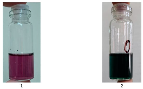 However, while assessing the uronic acid content in the reaction media of the oxidizing GGM samples using the modified “carbazole” method, atypical changes in the hydrolysates’ color is observed. During the starting periods until 3 h of reaction, the hydrolysates are characterized by a dark-green color instead of violet/purple (Figure 3), typical for carbazole–uronic acid complexes. This fact probably could be a reason of a significant error in the spectrophotometric determination of the uronic acid content in the GGM oxidizing reaction media hydrolysates.