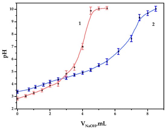 The potentiometric titration curves of the galactoglucomannan samples: (1) GGM initial; (2) GGM-T.