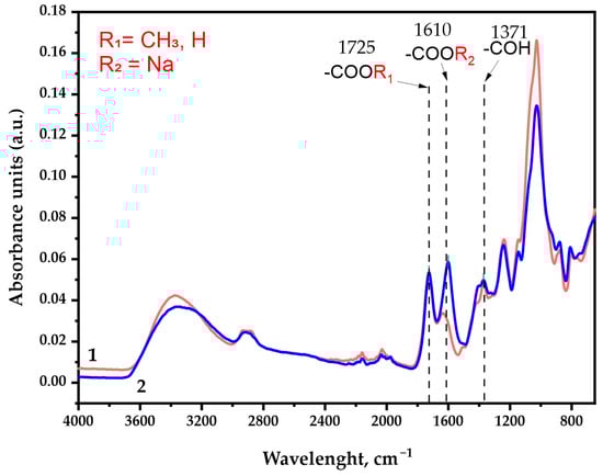 The FTIR spectra of the galactoglucomannan sample absorbance units: (1) GGM initial; (2) GGM-T.