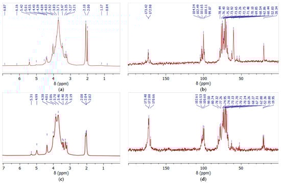 Moreover, this was also confirmed by the signal intensity changes at 60.44 ppm and 62.86 ppm, characterizing the methoxyl and ethoxyl groups’ presence, respectively. It is obvious that after the TEMPO-catalyzed oxidation its intensity significantly decreases, confirming the hypothesis of partial hydrolysis of the bonds (Figure 7b,d). At the same time, intense new signals appear in the 170–174 ppm region, corresponding to the C6 units of the uronic acids (mannuronic, galacturonic, and glucuronic) in esterified and protonated form [48]. The overlapping signals at δ 99–104 ppm in the anomeric region were attributed to the C-1 units of hexoses in the initial GGM, and after the TEMPO-catalyzed oxidation this region changes due to the increase in uronic acid signals.