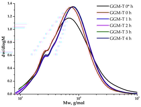 Polysaccharides’ molecular weight characteristics are crucial, determining many properties of such complexed systems. The observation of the GGM TEMPO-catalyzed oxidation (Figure 8) kinetics from the point of view of molecular weight changes on a polymer basis allows for controlling the reaction course. Moreover, its evaluation aids in selecting the experimental conditions that preserve the initial polymer structure into the future.