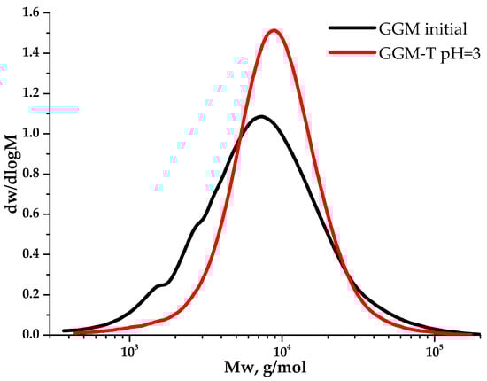 To determine the initial and oxidized GGM samples’ molecular weight characteristics (average molecular weights and polydispersity index (PD)), a multi-detector GPC/SEC Agilent 1260 Infinity II system (Agilent Technologies, Santa Clara, CA, USA) was used. The system was equipped with Agilent PL Aquagel-OH Mixed-M and Agilent PL Aquagel-OH-30 columns, using a 0.1 M NaNO3 solution combined with 250 ppm NaN3 dissolved in deionized water as a mobile phase. Before the analysis, the samples were dissolved in a mobile phase (5 mg/mL) and poured through a 0.45 µm Agilent PES membrane filter (Millipore, Burlington, MA, USA). Then, 100 µL of the studied sample was analyzed in an eluent flow with a 1 mL/min rate.