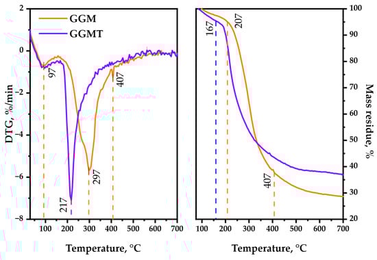 As was expected, the thermal degradation of the oxidized GGM-T begins earlier at lower temperatures compared to the initially isolated sample. Nevertheless, we assume that the ordered regions of the oxidized polysaccharide resist decomposition, which leads to a higher thermal stability, in general, with a greater mass perseverance.