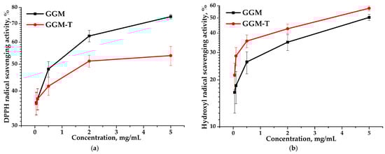 The ability of the initial and oxidized GGM samples to scavenge DPPH radicals was determined according to the method described in previous studies [18,26], with some improvements. The absorbance of the samples was measured at 517 nm against a blank, using an Ecoview UV 6900 spectrophotometer (Shanghai Mapada Instruments Co., Ltd., Shanghai, China).
