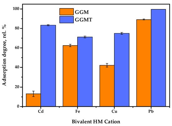 Noticeably, the relative difference ratio of Fe2+ adsorption by the GGM samples in conditions of single HM and competitive experiments has an equaling value. This could be due to the specifics of Fe2+ ions, which could interact with water in solutions, or caused by the substitution of hydrogen from the carboxyl groups formed by the TEMPO-catalyzed GGM oxidation. Moreover, it was expected that the Fe2+ ion adsorption selectivity would increase at the cost of less active ions such as Cu2+, which should be easily substituted, but on the contrary, that has no effect.