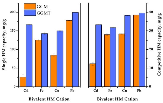 As was expected, the summary adsorption capacities for both the initial and oxidized GGM samples in most cases were lower to some extent, compared to the single HM ion AC. Nevertheless, since the same amount of the total HM ion concentrations was used in both single and competitive tests, it is important to note that the summary capacity of the initial GGM in conditions of a competitive experiment was higher than the capacity of single Cd2+ and Cu2+—107.3 ± 1.7 mg/g compared to 26.0 ± 5.7 and 84.6 ± 3.8 mg/g, respectively. As for the oxidized GGM derivative, its summary capacity in terms of the competitive tests was higher, in comparison to the initial GGM—143.1 ± 0.6 mg/g. However, due to the overall GGM-T greater single HM adsorption capacity, its summary AC values in a competitive experiment exceeds the AC values registered for Fe2+. This fact obviously demonstrates a competitive relationship between the investigated bivalent HM ion adsorption.