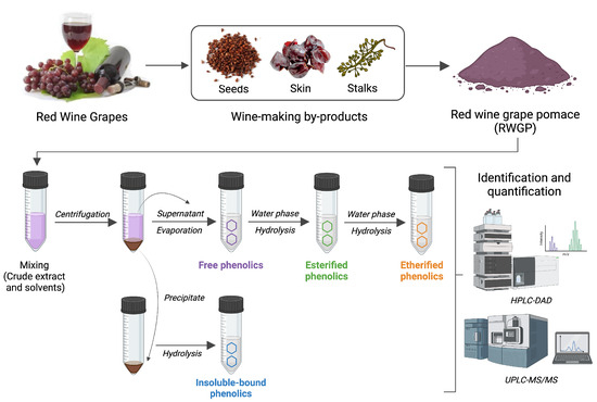 Main steps for the extraction of soluble (free, esterified, etherified) and insoluble-bound phenolic compounds from RWGP. Created in BioRender.com.