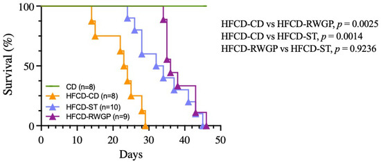 Effect of RWGP supplementation on survival of SR-B1−/−ApoE-R61h/h mice. Kaplan–Meier curves based on log-rank test for CD, HFCD-CD, HFCD-ST, and HFCD-RWGP groups.