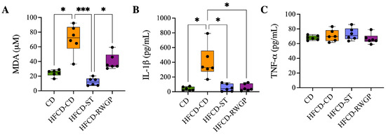 Effect of RWGP supplementation on oxidative stress and inflammatory markers. Plasma levels of (A) malondialdehyde (MDA), (B) interleukin-1 (IL-1), and (C) tumor necrosis factor-alpha (TNF-). Kruskal–Wallis test, followed by Dunn’s test for multiple comparisons. * p < 0.05, *** p < 0.001.