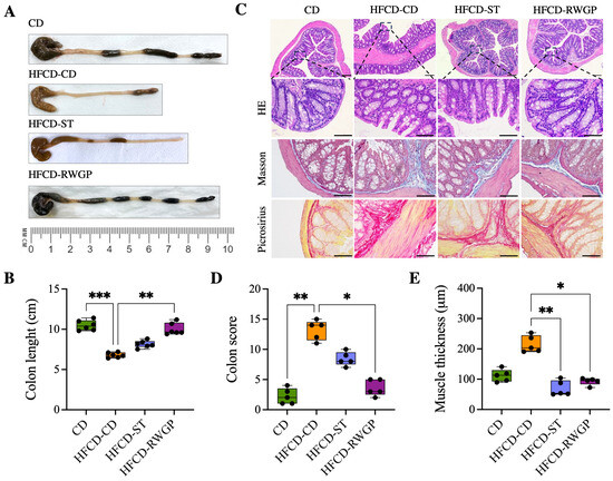 Figure 5 shows the effect of RWGP supplementation on gut integrity (Figure 5). HFCD-CD mice showed marked colon shortening compared to CD (6.75 cm vs. 10.4 cm, p = 0.0003), indicative of chronic inflammation and fibrosis (Figure 5A). RWGP supplementation significantly reversed colon shortening (9.65 cm, p = 0.0056 vs. HFCD-CD), whereas the statin-treated group (HFCD-ST) did not show significant improvements (p > 0.05) (Figure 5A,B). Histopathological analysis with HE, Masson’s Trichrome, Picrosirius Red staining evidenced that CD mice exhibited normal colonic structure, with no edema, inflammation or fibrosis (Figure 5C). HFCD-CD mice showed severe inflammatory cell infiltration, mucosal damage, and submucosal fibrosis. Notably, RWGP supplementation significantly attenuated fibrosis and restored colonic architecture, with lower histological scores and decreased mucus layer thickness (p = 0.0175 vs. HFCD-CD) (Figure 5D,E). The statin-treated group exhibited partial protection, but showed persistent fibrosis and inflammation (p < 0.05 vs. HFCD-CD).