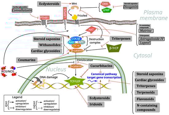 Agents targeting canonical Wnt signaling can be divided into two major subtypes: small-molecule inhibitors and monoclonal antibodies. The former usually refer to chemical compounds with a molecular weight of less than 1 kDa [27]—a definition which perfectly fits the majority of natural and nature-derived compounds. Among them, triterpenes [28], withanolides [29], steroidal saponins [30], taninns [31], proanthocyanidins [32], diterpenes [33,34,35], alkaloids [36,37,38], lignans, sesquiterpene lactones, sterols, and polysaccharides [39] have been reported as plant-based inhibitors of Wnt signaling. Their mechanism of action frequently involves the regulation of ROS/RNS (reactive oxygen species/reactive nitrogen species)-mediated crosstalk with the Wnt pathway (Figure 1).