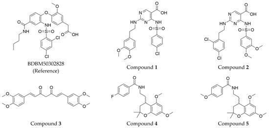 Chemical structures of predicted ABCC3 inhibitors. The reference compound, BDBM50302828, is presented alongside the five top-ranking compounds selected for testing. Compound 3 was identified as dimethoxycurcumin, a methylated natural derivative of curcumin, while Compounds 1, 2, 4, and 5 are structurally diverse synthetic compounds without natural product origins. Compounds 4 and 5 were synthesized as racemic mixtures, as indicated by the wavy bond notation.