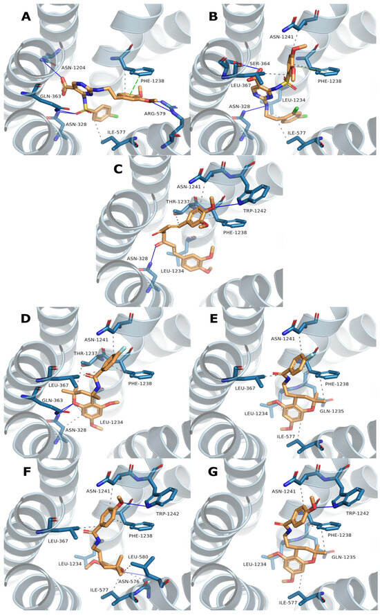 Predicted binding poses and interaction profiles of selected ABCC3 hit compounds. AutoDock Vina blind docking identified top-ranked poses in the ABCC3 transporter’s main channel. Key non-covalent interactions—hydrogen bonds (solid lines), hydrophobic contacts (gray dashed), and π–π stacking (green dashed)—were identified using PLIP. Panels (A–C) show Compounds 1–3; (D,E) and (F,G) depict the R and S enantiomers of Compounds 4 and 5, respectively.