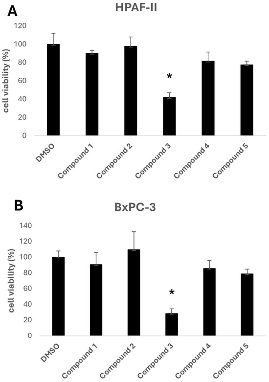Cell viability of HPAF-II (A) and BxPC-3 (B) cells after 72 h treatment with 10 μM of Compounds 1–5 or DMSO (vehicle control). Viability was assessed by crystal violet staining and is expressed as a percentage. Data are presented as mean ± SEM from three independent experiments. Statistical analysis was performed using repeated measures of one-way ANOVA, followed by Dunnett’s post hoc test to compare treatments to the control. * p < 0.05 was considered statistically significant.