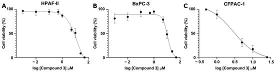 Dose-Response curve of Compound 3 for IC50 determination in (A) HPAF-II (0.001–50 µM), (B) BxPC-3 (0.001–50 µM), and (C) CFPAC-1 (0.1–25 µM) cell lines. Data are presented as mean ± SEM of the three independent experiments.