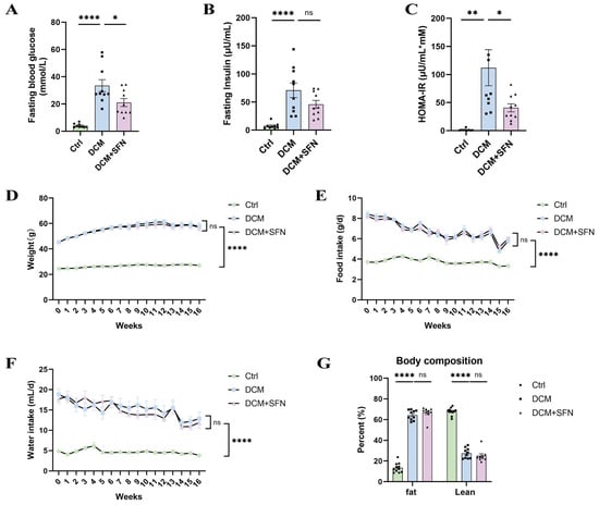 SFN-I improves diabetic metabolic phenotype but not the three symptoms in db/db mice. (A–C) Serum levels of fasting glucose and insulin, and HOMA-IR at week 16. (D) Body weights were monitored weekly throughout the 16-week intervention period. (E,F) The daily food and water intake of each group of mice was statistically analyzed on a weekly basis for a total of 16 weeks. (G) The percentage of body fat and lean mass at week 16. Data are expressed as the mean ± SEM (n = 9–11). * p < 0.05, ** p < 0.01, **** p < 0.0001: significantly different as indicated; ns: not significantly different. HOMA-IR, homeostatic model assessment for insulin resistance; Ctrl, control; DCM, diabetic cardiomyopathy; SFN, sulforaphane.
