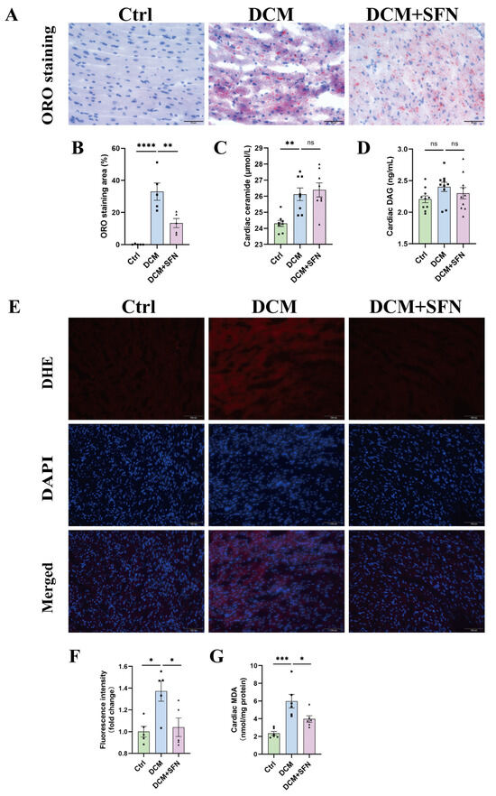 SFN-I reduces cardiac lipid accumulation and oxidative stress without significantly altering ceramide and DAG levels in db/db mice. (A,B) Representative ORO staining of hearts and quantification of lipid accumulation (scale bar = 50 μm). (C,D) Cardiac levels of ceramide and DAG. (E,F) Representative fluorescence images of DHE-stained hearts (scale bar = 100 μm) and quantification of the fluorescence intensity. (G) Cardiac levels of MDA. Data are expressed as the mean ± SEM (n = 5–8). * p < 0.05, ** p < 0.01, *** p < 0.001, **** p < 0.0001: significantly different as indicated; ns: not significantly different. ORO, Oil Red O staining; DAG, diacylglycerol; DHE, dihydroethidium; MDA, malondialdehyde; Ctrl, control; DCM, diabetic cardiomyopathy; SFN, sulforaphane.