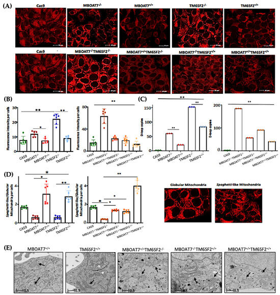 3.2. Mitochondrial Morphology Is Restored by the Expression of Wild-Type MBOAT7 and/or TM6SF2 Proteins in Knock-Out Models