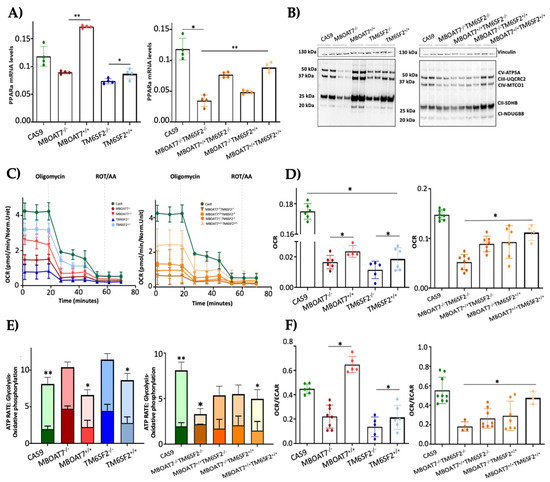 3.3. The Overexpression of WT MBOAT7 and/or TM6SF2 Proteins in KO Cells Rescues Mitochondrial Function