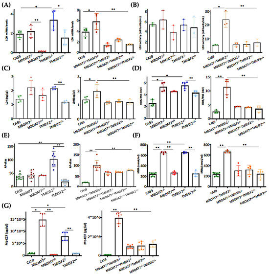3.4. The Restoration of WT MBOAT7 and/or TM6SF2 Proteins in KO Cells Attenuates Hepatocellular Damage