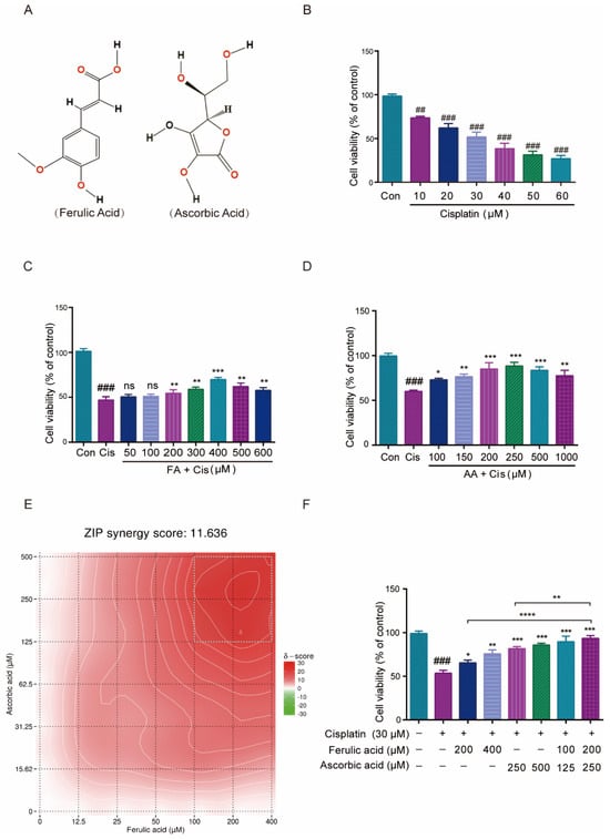 Given the limitations of current protective strategies, natural antioxidants like FA and AA have emerged as promising candidates. FA attenuates Cis-induced cytotoxicity by scavenging ROS and boosting endogenous antioxidants [24], while AA has been shown to reduce ototoxicity in models of drug-induced hearing loss [25]. In other models, FA and AA exert a synergistic effect on each other, for instance, isoproterenol-induced myocardial infarction in rats, cardiac toxicity caused by β-adrenergic catecholamines in rats, and skin aging caused by light irradiation [26,27,28]. Since MAPK/MMP9 signaling is a critical mediator of Cis-induced damage, we hypothesize that FA and AA may protect against ototoxicity by modulating this pathway.