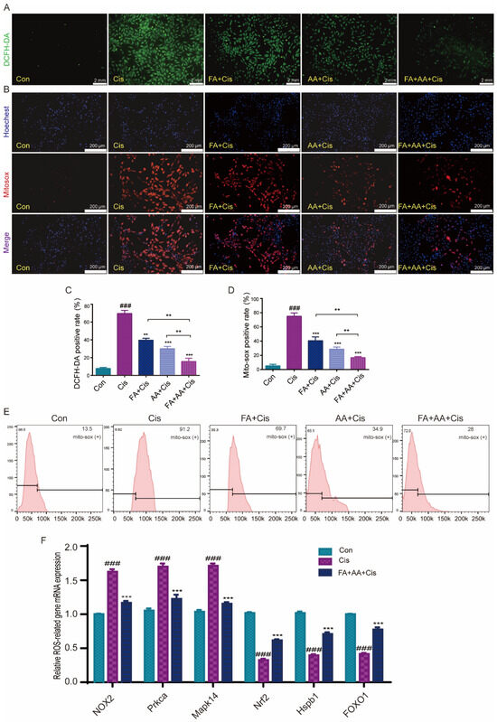 Effects of FA, AA, and FA+AA on ROS production in HEI-OC1 cells after Cis injury. (A) The intracellular ROS level was measured using a peroxide-sensitive fluorescent probe, DCFH-DA. Scale bars = 2 mm. (C) Representative quantitative changes in DCFH-DA in HEI-OC1 cells from each group; for each group, n = 3. (B,E) Representative images and quantitative changes in Mitosox-red in HEI-OC1 cells from each group; for each group, n = 3. Scale bars = 200 μm. (D) Representative quantitative changes in Mitosox-red in HEI-OC1 cells from each group (flow cytometry detection); for each group, n = 3. (F) Using qPCR analysis, we examined six ROS-related gene expression levels (NOX2, Prkca, Mapk14, Nrf2, Hspb1, and FOXO1) to validate the increased generation of ROS. In our analysis, GAPDH is a housekeeping gene for normalization; for each group, n = 3. Results represent the mean of three independent experiments ± the mean of SEM experiments. ** p < 0.01, *** p < 0.001. ### p < 0.001.