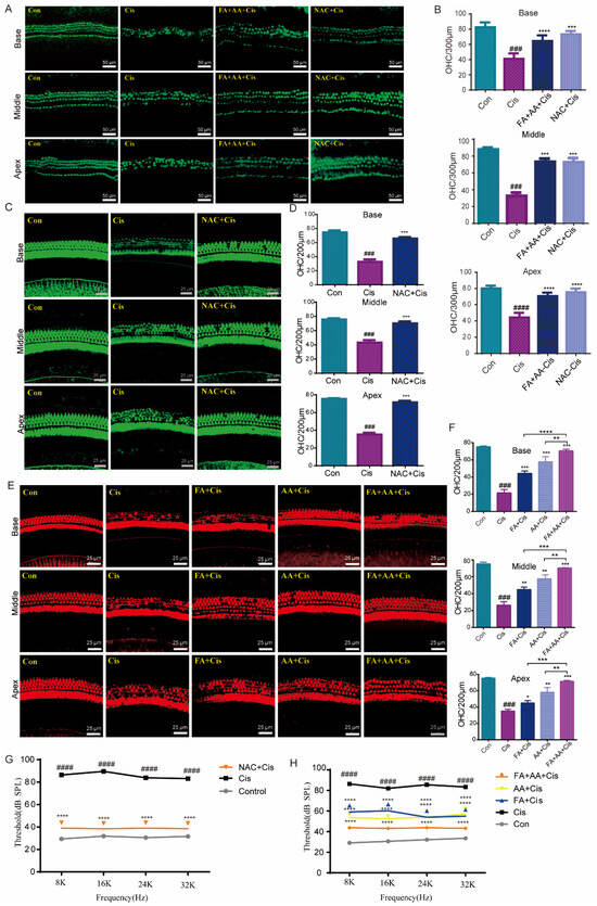 FA and AA are protective in explants and in vivo. (A) Representative immunofluorescence photograph showing the apex, middle, and base regions of the cochlear explants treated with medium-alone Con, Cis, and FA+AA+Cis for 24 h, and immunolabeled for myosin7a (green). Scale bars = 50 μm. (B) The illustration of OHCs counting (myosin7a, green) (n = 3). (C) Immunostaining with Alexa Fluor 594 phalloidin in the apex, middle, and base turns of cochleae from different groups in vivo. Scale bars = 25 μm. (D) The illustration of OHCs counting; for each group, n = 6. (E) Immunostaining with Alexa Fluor 488 phalloidin in the apex, middle, and base turns of cochleae from different groups in vivo. Scale bars (25 μm). (F) The illustration of OHCs counting; for each group, n = 6. (G) ABR thresholds at 8, 16, 24, and 32 kHz were measured 14 days after the injection of saline (Con), cisplatin 30 mg/kg (Cis), or cisplatin plus 150 mg/kg NAC (NAC+Cis) (each group, n = 6 mice). (H) ABR thresholds at 8, 16, 24, and 32 kHz were measured 14 days after the injection of saline (Con), cisplatin 30 mg/kg (Cis), or cisplatin plus 50 mg/kg FA + 75 mg/kg AA (FA+AA+Cis) (each group, n = 6 mice). The data represent mean ± SEM; * p < 0.05, ** p < 0.01, *** p < 0.001, **** p < 0.0001; ### p < 0.001, #### p < 0.0001.