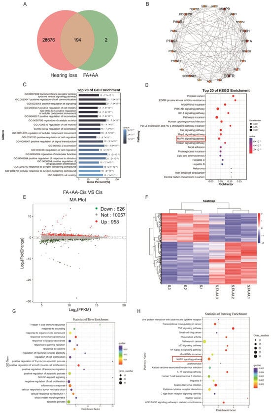 We aim to explore the potential mechanism for FA and AA by using network pharmacology. To this end, FA and AA were separately searched using the PubChem database (https://pubchem.ncbi.nlm.nih.gov/, accessed on 21 October 2023); the SMILE numbers were entered into the SwissTarget prediction database (http://www.swisstargetprediction.ch/, accessed on 25 October 2023), and the Super-PRED (https://prediction.charite.de/index.php, accessed on 1 November 2023) database predicted a total of 196 targets. The GeneCard human gene database, DisGenet database (https://www.disgenet.org/), and OMIM database (https://omim.org/) were used to conduct target searches using “hearing loss” as the search term. The species was set to “human” to obtain the disease target genes. Disease targets that were retrieved from the databases were merged and duplicates removed, and a final list of 28,870 disease targets was obtained. The screened drug targets and disease targets were entered into the Venn diagram creation software Venny 2.1, and 194 shared targets were obtained (Supplementary Materials); these targets were used as predicted targets for the effects of drugs on diseases in subsequent analyses, as shown in Figure 5A. A PPI network was constructed with these 194 potential targets using the String database. The first 22 of these targets were visualized with Cytoscape 3.7.2 according to the degree, as shown in Figure 5B. To determine the possible mechanisms by which FA+AA ameliorates Cis ototoxicity, 194 predicted targets were subjected to GO and KEGG enrichment analyses. The top 20 major KEGG pathways that were involved in the FA+AA-mediated amelioration of Cis ototoxicity were identified based on p values (p < 0.05) and count values (Figure 5C,D). These included MAPK signaling pathways that are involved in important biological responses, such as cell proliferation, differentiation, and apoptosis. Next, we performed the transcriptome sequencing of the FA+AA+Cis and Cis groups to further identify potential target genes regulated by FA+AA treatment in HEI-OC1 cells, and the results are shown in Figure 5E,F; RNA-seq analyses identified 1584 differentially expressed genes (958 upregulated and 626 downregulated). GO and KEGG analyses were performed to elucidate the most possible signaling pathway. As shown in Figure 5G,H, the MAPK signaling pathway interested us most in the top 20 altered signaling pathways, as this pathway was also enriched in our network pharmacology analysis (Figure 5D).