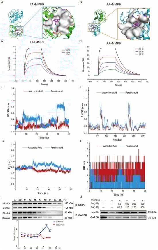 As we enriched MMP9 by network pharmacology, we further performed molecular docking for interaction between FA and AA with MMP9. As shown in Figure 6A,B, FA could interact with MMP9 via hydrophobic contacts with residues Leu 418, Leu 397, and Arg 424 as well as hydrogen bonds with Glu 402, and carbon–hydrogen bonds with Pro 415 and Met 422. AA established hydrogen connections with the MMP9 residues Arg 424, Met 422, Tyr 420, and Ala 417 (Figure S3). FA and AA displayed binding affinities of −7.0 kcal/mol and −6.6 kcal/mol for MMP9. Furthermore, surface plasmon resonance (SPR) investigations revealed that FA and AA could bind directly to MMP9 (Figure 6C,D). All-atom molecular dynamics simulations were performed using the beginning structures of the small molecules and protein complexes generated by the aforementioned docking methods (see Section 2). The simulations were run with Gromacs 2020.6 software, and further analyses such as Root Mean Square Deviation (RMSD), Root Mean Square Fluctuation (RMSF), radius of gyration (Rg), and hydrogen bonding were performed (Figure 6E–H). The RMSD value of AA remained between 0.1 nm and 0.4 nm throughout the simulation process. For FA, the small molecules in the first 38 ns of the simulation are similar to AA, always remaining bound to the protein-binding cavity and shaking. After maintaining stable binding in the new binding cavity (RMSD = 0.8 nm) for a period of time (38 ns–46 ns), small molecules spontaneously migrate to the original protein-binding cavity again under the influence of the surrounding environment and thermal motion and maintain stable binding until the end of the simulation, indicating that the previous binding cavity is still the dominant binding conformation of FA (Figure 6E). RMSF analysis demonstrated structural adaptability. As shown in Figure 6F, there was a certain peak in the protein RMSF curve during the entire simulation process. Overall, the RMSF of the FA complex is higher than that of AA. Combined with the RMSD analysis, this result may reflect the detachment of FA from the original protein-binding cavity during the simulation process, which has a certain impact on the flexible residues of the protein. Next, we conducted an Rg analysis to characterize the compactness of protein structures (Figure 6G). The results were consistent with the RMSD and RMSF analyses results, with the average Rg value of FA higher than that of AA. Overall, the Rg curves of the two complex proteins tended to stabilize with the simulation, indicating that the complex gradually stabilized. Based on the HBond plot and the previous analysis, it can be concluded that AA and FA have always formed a certain number of hydrogen bonds with proteins during the simulation process (Figure 6H). Among them, AA maintains a relatively stable number of 3–5 hydrogen bonds in the later stage of the simulation. Although FA forms fewer hydrogen bonds than AA, it still maintains at least one hydrogen bond with the protein during the simulation process, and its binding is relatively stable. The overall stability of the AA complex was superior to that of the FA complex, with substantially stronger binding. Furthermore, a CETSA [33,34] demonstrated that FA+AA improved MMP9 thermal stability (Figure 6I). We evaluated the stability of MMP9 and GAPDH. FA and AA can enhance thermal stability, even at temperatures exceeding 50 °C, a property that is diminished in control samples lacking FA and AA. We discovered that there was little variation in the degradation temperature between MMP9 and GAPDH in the control group. A DARTS [34,35] experiment revealed that, even at lower concentrations of FA+AA, MMP9 is well protected from protease degradation, suggesting that FA+AA could stabilize MMP9 and enhance its resistance to protein hydrolysis in the assay (Figure 6J). These results suggest that FA and AA could bind to MMP9 directly and, thus, regulate its protein level.