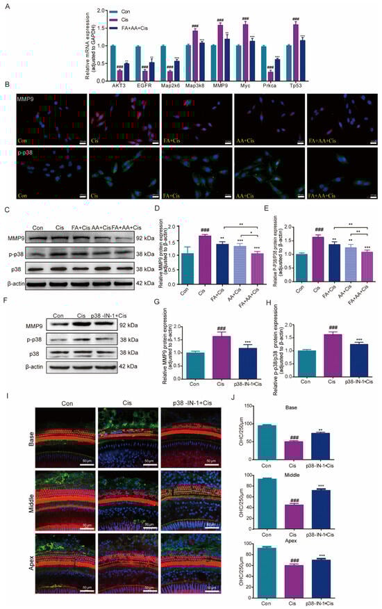To corroborate the RNA-seq data, eight MAPK-signaling-pathway-related genes, including MMP9, were chosen to be measured by qPCR for their expression. The results confirmed that the mRNA expressions of Map3k8, MMP9, Myc, and Tp53 were elevated by Cis administration, whereas they decreased in the FA+AA+Cis group. Akt3, Egfr, Map2k6, and Prkca were downregulated in the Cis group and only slightly increased in the FA+AA+Cis group (Figure 7A). Akt3, Egfr, Map2k6, and Prkca regulate biological functions such as cell survival and metabolism, cell proliferation, stress response, and cell invasion. P38 is an important member of the MAPK family. Furthermore, we investigated the effects of FA, AA, and FA+AA on the expression of MMP9 and p-p38 in HEI-OC1 cells. As illustrated in Figure 7B–E, FA, AA, and FA+AA reduced the levels of these two proteins to varying degrees. In particular, both MMP9 and p-p38 protein expression were lowest in the FA+AA group. We wanted to know if inhibiting the p38 signaling pathway can have a protective effect. Next, we evaluated the levels of p38 protein in the Cis, P38 MAPK-IN-1+Cis, and Con groups to determine the impact of these treatments on the MAPK signaling pathway (Figure 7F–H). In the Cis group, the expression of MMP9 and p-p38 proteins was increased. Our qPCR data showing the downregulation of MMP9 mRNA aligns with observed reductions in MMP9 protein and preserved hair cell counts, supporting a potential transcriptional repression mechanism for FA+AA-mediated protection. These data suggest that the protective effects of FA+AA against Cis-associated ototoxicity may involve, at least in part, the inhibition of the p38 MAPK signaling and MMP9. Pretreatment with the MAPK inhibitor P38 MAPK-IN-1 (1 mg/kg, i.v.) two hours before Cis treatment enhanced the number of cochlear outer hair cell survivors in both apex, middle, and base structures (Figure 7I,J). In the FA+AA treatment group, we performed immunofluorescence staining on mouse cochlear hair cells and observed the expression of MMP9 protein in the outer hair cells (Figure S4C). MMP9 was predominantly localized to the cytoplasm of OHCs. Co-treatment with FA+AA reduced the overall expression of MMP9 and decreased cytoplasmic accumulation. These data imply that FA+AA’s protective impact against Cis-associated ototoxicity is at least largely through the inhibition of p38MAPK signaling and MMP9.