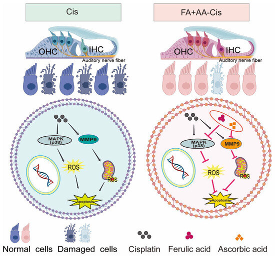 Although FA and AA have been individually investigated in Cis-induced ototoxicity, their combined effects on MMP9 through p38 MAPK pathway modulation have not been systematically examined. This study investigates whether FA and AA exert protective effects by suppressing oxidative stress and MMP9 activation via the MAPK pathway, offering potential therapeutic strategies to prevent Cis-associated hearing loss.