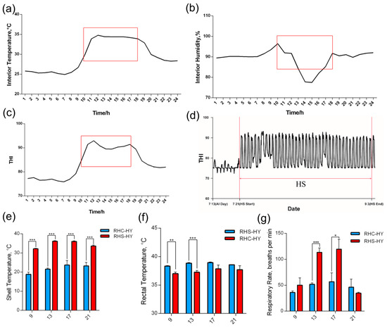 Environmental control and monitoring of body temperature and respiratory rate in sows during early gestation under HS conditions. (a) Daily average indoor ambient temperature, (b) daily average interior humidity, (c) daily average temperature–humidity index (THI) value, (d) THI variation over time, (e) surface body temperature, (f) rectal temperature, and (g) respiratory rate. Note: The red box highlights the specific time intervals designated for heat stress exposure. *, p < 0.05; **, p < 0.01; and ***, p < 0.001.