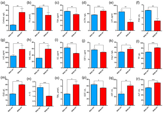 To further evaluate the physiological responses of pregnant sows under heat stress conditions, we analyzed serum hormone levels and liver function indicators. Compared with the RHC-HY group, the RHS-HY group exhibited significantly elevated cortisol levels (72.37 ± 14.90 vs. 22.51 ± 1.55 μg/L) (p < 0.001) (Figure 2a). Thyroid function-related indicators showed significant changes, with T3 and TSH levels significantly decreasing (92.19 ± 15.47 vs. 136.20 ± 2.87 pmol/L and 34.07 ± 4.64 vs. 38.28 ± 0.48 pg/mL, respectively) (p < 0.01) (Figure 2b,c). Additionally, adrenal function was significantly altered, as evidenced by a significant increase in ACTH expression (46.66 ± 3.17 vs. 37.44 ± 1.18 ng/L) (p < 0.001) (Figure 2d). Reproductive hormone levels also changed: LH1 and FSH levels were significantly reduced (202.31 ± 65.32 vs. 449.79 ± 42.05 pg/mL and 3.09 ± 0.73 vs. 6.32 ± 0.09 U/L) (p < 0.01) (Figure 2e,f), while LH2 levels were significantly increased (366.15 ± 80.03 vs. 234.23 ± 28.94 pg/mL) (p < 0.01) (Figure 2g). Metabolism-related indicators revealed that INS levels in the RHS-HY group were significantly higher (p < 0.01) (59.51 ± 10.25 vs. 31.23 ± 0.31 mU/L) (Figure 2h), whereas GC (28.74 ± 0.50 vs. 39.78 ± 1.99 pg/mL) (p < 0.001) and IGF-1 (9.93 ± 1.20 vs. 10.74 ± 0.55 μg/mL) (p < 0.05) levels were significantly lower (Figure 2i,j). Furthermore, the expression of Ang-I was significantly upregulated (36.58 ± 2.20 vs. 30.97 ± 0.84 ng/L) (p < 0.05) (Figure 2k).