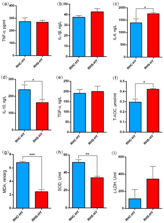 Simultaneously, the analysis of liver function indicators revealed that compared with the RHC-HY group, the levels of TP, GLB, TBIL, AST, and ALT in the RHS-HY group were significantly elevated (p < 0.05). Notably, the levels of TBIL and AST exceeded the reference ranges: TBIL was 6.50 ± 1.10 μmol/L (reference range: 0.0–5.0 μmol/L) and AST was 114.67 ± 7.51 U/L (reference range: 16–65 U/L) (Figure 2l–r). Additionally, we analyzed the A/G ratio and found it to be significantly reduced (p < 0.001) (Figure 2n), indicating that heat stress (HS) caused hepatocyte damage, thereby affecting liver metabolism, detoxification, and anti-inflammatory functions. Compared with the RHC-HY group, the pro-inflammatory cytokine IL-6 in the RHS-HY group was significantly increased (p < 0.05) (Figure 3c), while the levels of TNF-α and IL-1β showed no significant differences (Figure 3a,b). The expression level of the anti-inflammatory cytokine IL-10 was significantly decreased (p < 0.05) (Figure 3d), further suggesting an imbalance in inflammatory responses. To further evaluate antioxidant capacity, we conducted additional tests. The results indicated that compared with the RHC-HY group, total antioxidant capacity T-AOC in the RHS-HY group was significantly increased (p < 0.05) (Figure 3f), whereas MDA and SOD levels were significantly decreased (p < 0.05) (Figure 3g,h). L-LDH showed an increasing trend (Figure 3i). The above findings comprehensively indicate that heat stress impairs liver function and increases inflammatory levels in pregnant sows. Additionally, the results suggest that the RHS-HY group exhibited enhanced overall antioxidant defense system activity, with the antioxidant system effectively neutralizing free radicals.