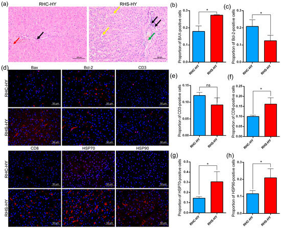 Given the abnormal liver function observed in the blood, we analyzed pathological changes in liver tissue under HS. In the RHS-HY group, a small number of lymphocytes (indicated by black arrows) were observed around portal areas, accompanied by sporadic hepatocyte necrosis (green arrows), a mild dilation of hepatic sinusoids (yellow arrows), and disorganized hepatic cords with widened spacing (Figure 4a). No significant necrosis or abnormalities were detected in the liver tissues of the RHC-HY group. Thus, compared to the RHC-HY group, the RHS-HY group exhibited marked liver tissue damage. Further analysis confirmed these findings through apoptotic activity assessment. Immunofluorescence assays revealed that, compared with the RHC-HY group, the pro-apoptotic protein Bax was significantly elevated (p < 0.05) (Figure 4b), while anti-apoptotic protein Bcl-2 levels were significantly reduced (p < 0.05) (Figure 4c), indicating enhanced apoptotic activity. Additionally, no significant difference was observed in CD3-positive cells (Figure 4e); however, CD8 expression was significantly increased (p < 0.05) (Figure 4f), suggesting the activation of cytotoxic T lymphocytes (CTLs), which may contribute to further hepatocyte damage. Moreover, heat shock proteins HSP70 and HSP90 in hepatocytes were significantly upregulated (p < 0.05) (Figure 4g,h), likely as a protective response to protein damage and cellular stress induced by heat stress.