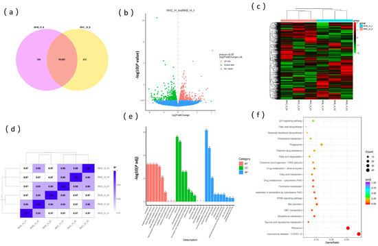 The RHS-HY and RHC-HY groups generated 135,774,834 and 153,692,812 clean reads, respectively (Table 2), with a total base count of 43.41 Gb (≥6.3 Gb per sample). Quality assessment revealed Q20 > 98.58%, Q30 > 95.94%, and GC content between 49.84% and 50.43% (Table S1). Combined with qualified FPKM values, these metrics confirm the high quality of transcriptome sequencing data (Figure 5a). Comparative transcriptomic analysis between the RHS-HY and RHC-HY groups identified 10,007 commonly expressed genes, with 326 upregulated and 257 downregulated genes in the RHS-HY group relative to controls (Figure 5b). Applying a significance threshold (p < 0.05), we detected 992 differentially expressed genes (DEGs), comprising 508 upregulated and 484 downregulated genes (Figure 5c). The hierarchical clustering of DEGs revealed a clear segregation of the two experimental groups (Figure 5d), supported by high intra-group consistency (Pearson correlation coefficients > 0.97; Figure 5e). The functional annotation of DEGs through GO enrichment analysis assigned 13,570 terms, predominantly in molecular functions (49.9%), followed by biological processes (31%) and cellular components (19%), indicating their primary regulatory roles in hepatic molecular functions such as oxidoreductase activity, peptide biosynthesis, and amide metabolism (Figure 5f). KEGG pathway analysis further demonstrated significant enrichment in taurine/hypotaurine metabolism, glutathione metabolism, bile secretion, PPAR signaling, and pyrimidine metabolism (Figure 5g).