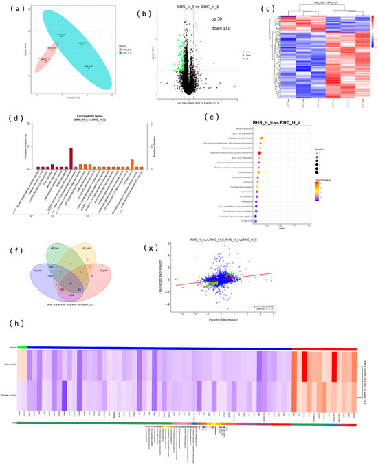 Proteome and transcriptome association analysis. (a) PCA of protein profiles in the RHC-HY and RHS-HY groups; (b) differential protein expression analysis between the RHC-HY and RHS-HY groups; (c) hierarchical clustering of differentially expressed proteins; (d) gene ontology (GO) enrichment analysis of differentially expressed proteins; (e) KEGG pathway analysis of differentially expressed proteins; (f) Venn diagram illustrating co-expression patterns of genes and proteins; (g) correlation analysis of differential gene and protein expression levels; and (h) KEGG pathway analysis of co-expressed genes and proteins.