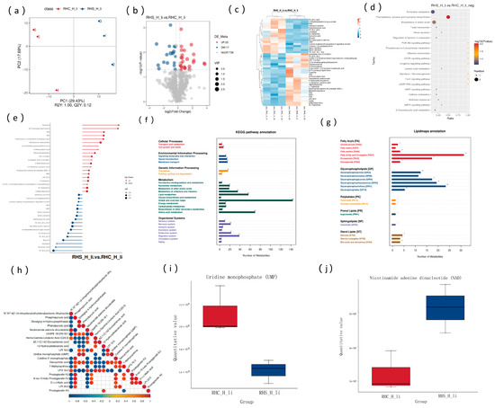 Liver metabolic characteristics and their association with transcriptome and proteome. (a) Partial least squares discriminant analysis (PLS-DA) of metabolites (pos); (b) differential expression analysis of metabolites; (c) hierarchical clustering of differentially expressed metabolites; (d) enrichment analysis of differentially expressed metabolites; (e) differentially expressed metabolites; (f) KEGG pathway annotation of differentially expressed metabolites; (g) annotation of lipid metabolites; (h) correlation analysis of differentially expressed metabolites; (i) expression levels of UMP in the RHS-HY and RHC-HY groups; and (j) expression levels of NAD in the RHS-HY and RHC-HY groups.