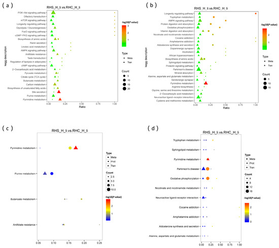 Association analysis of differential metabolites, genes, and proteins. (a) KEGG pathway enrichment analysis of the association between differential metabolites and genes (neg); (b) KEGG pathway enrichment analysis of the association between differential metabolites and genes (pos); (c) KEGG pathway enrichment analysis of the correlation among differential metabolites, genes, and proteins (neg); (d) KEGG pathway enrichment analysis of the correlation among differential metabolites, genes, and proteins (pos).