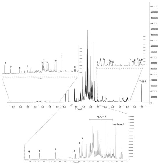 1H-NMR profile of BPE. a = isoleucine; b = leucine; c = valine; d = fatty acids; e = threonine; f = alanine; g = GABA; h = citric acid; i = succinic acid; j = asparagine; k = flavonoids; l = fumaric acid; m = tyrosine; n = phenylalanine; o = formic acid; p = trigonelline; q = sucrose; r = α-glucose; s = β-glucose; t = fructose. TMSP = 3-(trimethylsilyl)-propionic acid-2,2,3,3-d4 (internal standard).