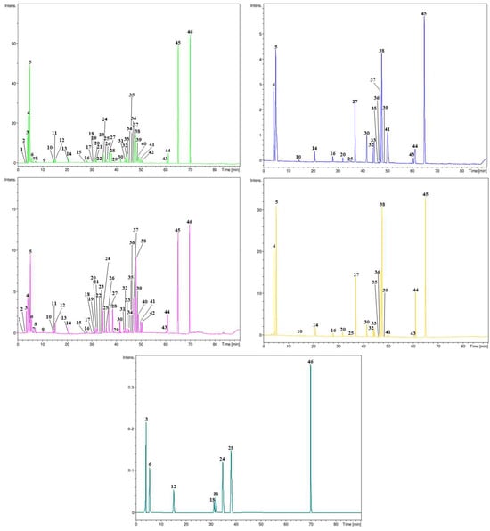 The LC-DAD-ESI-MS/MS analysis revealed a highly diverse profile of secondary metabolites in the BPE, highlighting its rich phytochemical composition (Table 5 and Figure 2).