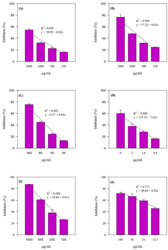 The iron-chelating activity (ICA, panel C), as well as the anti-peroxidative action by means of the β-carotene bleaching test (BCB, panel F), was also evaluated. As can be seen from Figure 2, the extract exhibited consistent linear trends (R2 ≥ 0.777) across all assays.